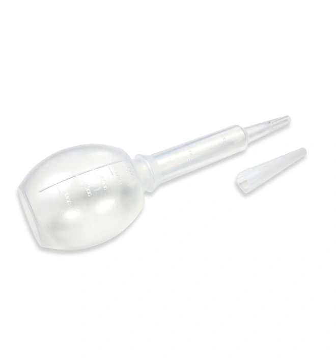 Läuft die Spülflüssigkeit nicht spontan aus dem Blasenkatheter zurück, kann vorsichtig mit der Ballon-Blasenspritze aspiriert werden. Zu starkes Aspirieren sollte vermieden werden um die Blasenschleimhaut nicht durch Ansaugen des Katheters zu verletzen. Das Risiko dieser schmerzhaften Komplikation wird durch das abgerundete und geschlossene Ende des Nelotan-Katheters verringert und ermöglicht eine schonendere Aspiration für den Patienten. Die Graduierung der Ballon-Blasenspritze von 5 bis 100ml erlaubt die genaue Volumenkontrolle des applizierten oder aspirierten Mediums während der Indikation